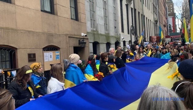 Генеральний консул України у Нью-Йорку Олексій Голубов запевнив учасників мітингу, що «жоден воєнний злочин, скоєний армією рф, жодне криваве злодіяння на нашій землі не залишиться поза увагою правосуддя».