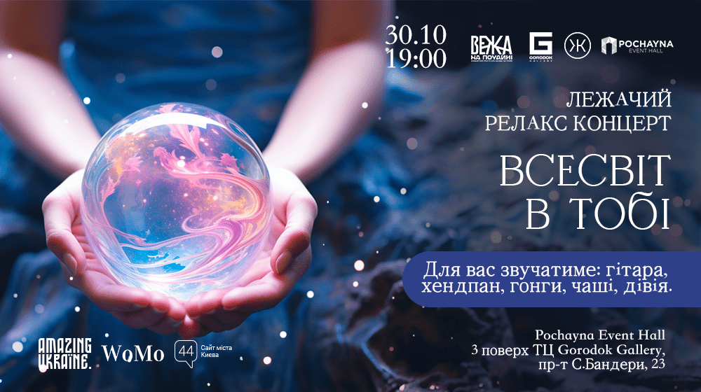 З давніх часів відомо, що звук магічно діє на душу і тіло людини, а кожна стародавня культура має свої сакральні звукові техніки. Кожного останнього понеділка місяця у Pochayna Event Hall проходять концерти за авторською методикою музичної релаксації. “Всесвіт у тобі” – це розслаблююча медитативна духовна подорож під музику найрідкісніших інструментів, що звучали під час сакральних ритуалів давніх народів. Заворожливе звучання колекції гонгів і співочих чаш, діджеріду та варгану, біли, хендпану, шейкерів, дівьї, розслаблюють, занурюючи у лагідний океан заспокоюючих звуків. У Pochayna Event Hall знаходиться найбільша колекція гонгів і одна з найбільших колекцій чаш в Україні, завдяки чому створюється неповторний об’ємний саунд. Це буде глибока й потужна групова музична медитація: кожен гість вийде із сеансу оновлений, підсилений й наповнений цілющими вібраціями, які зможе передати оточуючим.